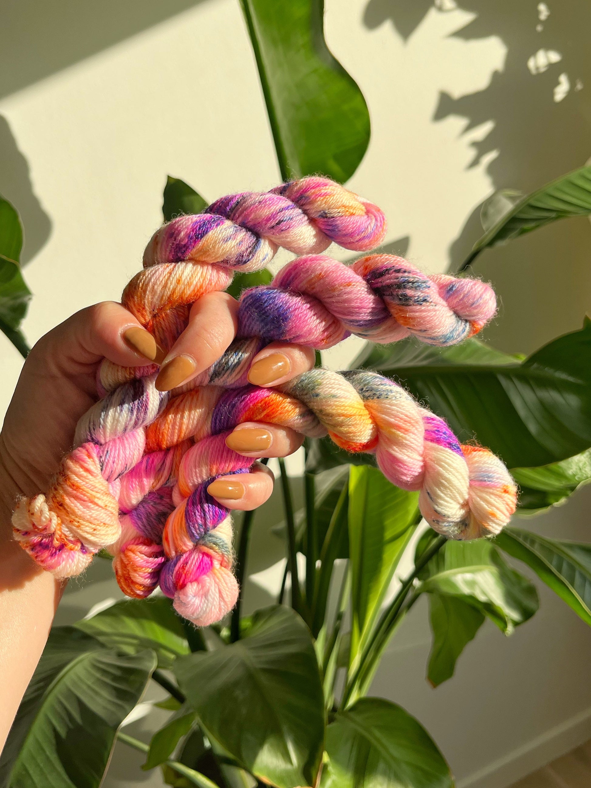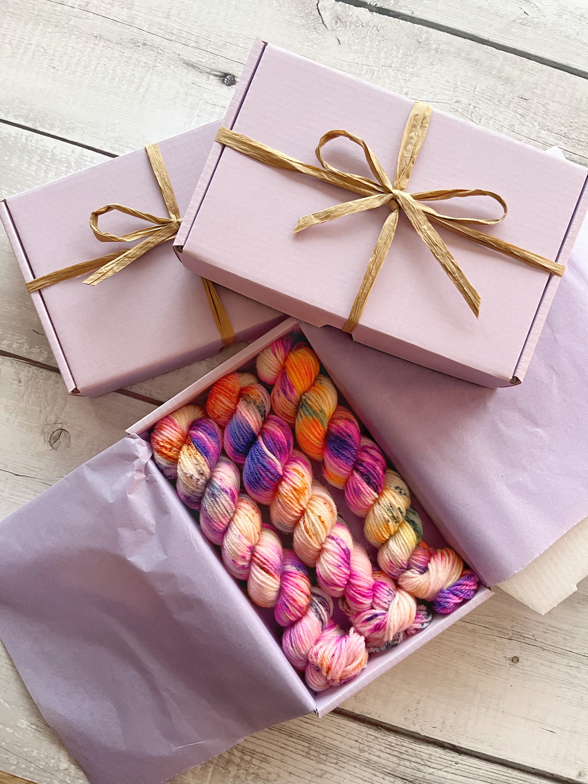 Gaveæske med 3 minifed håndfarvet garn, smukt indpakket og perfekt som kreativ gave eller selvforkælelse.