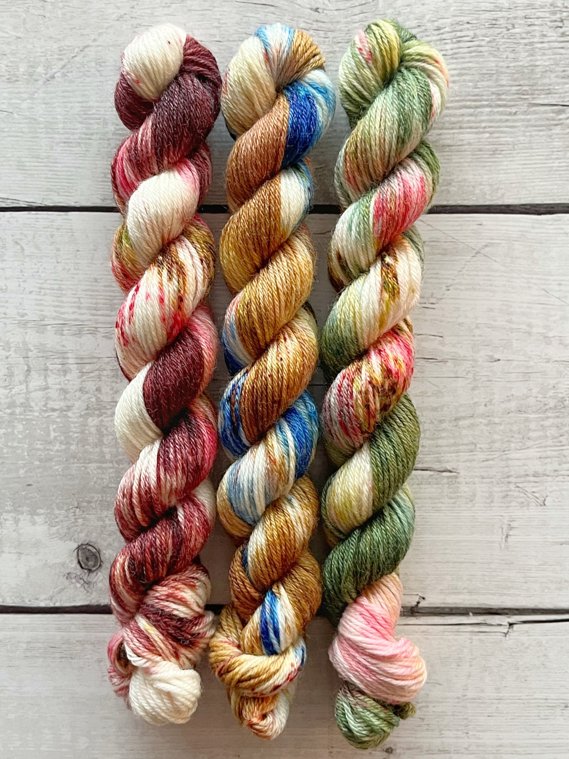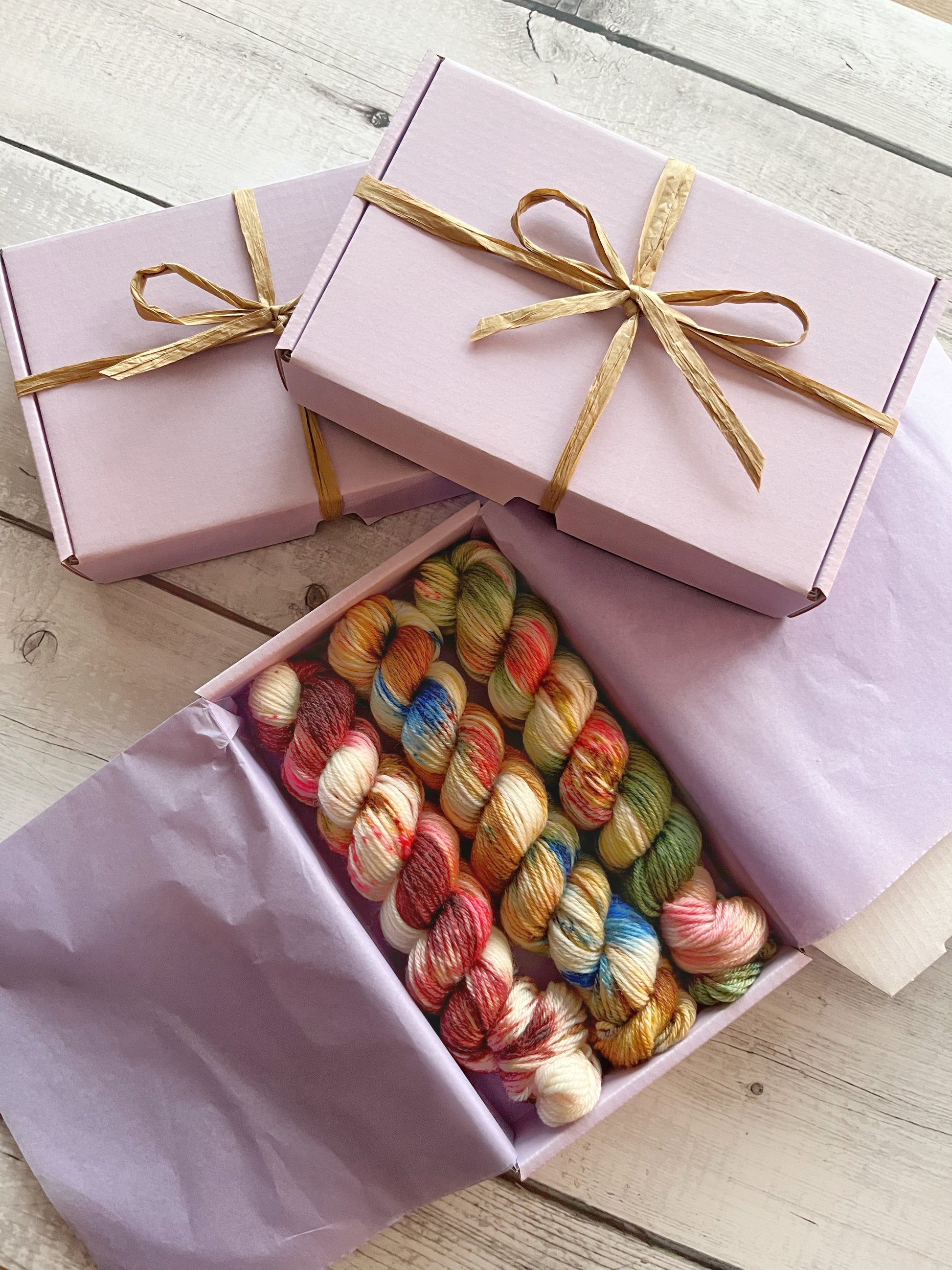 Gaveæske med 3 minifed håndfarvet garn, smukt indpakket og perfekt som kreativ gave eller selvforkælelse.